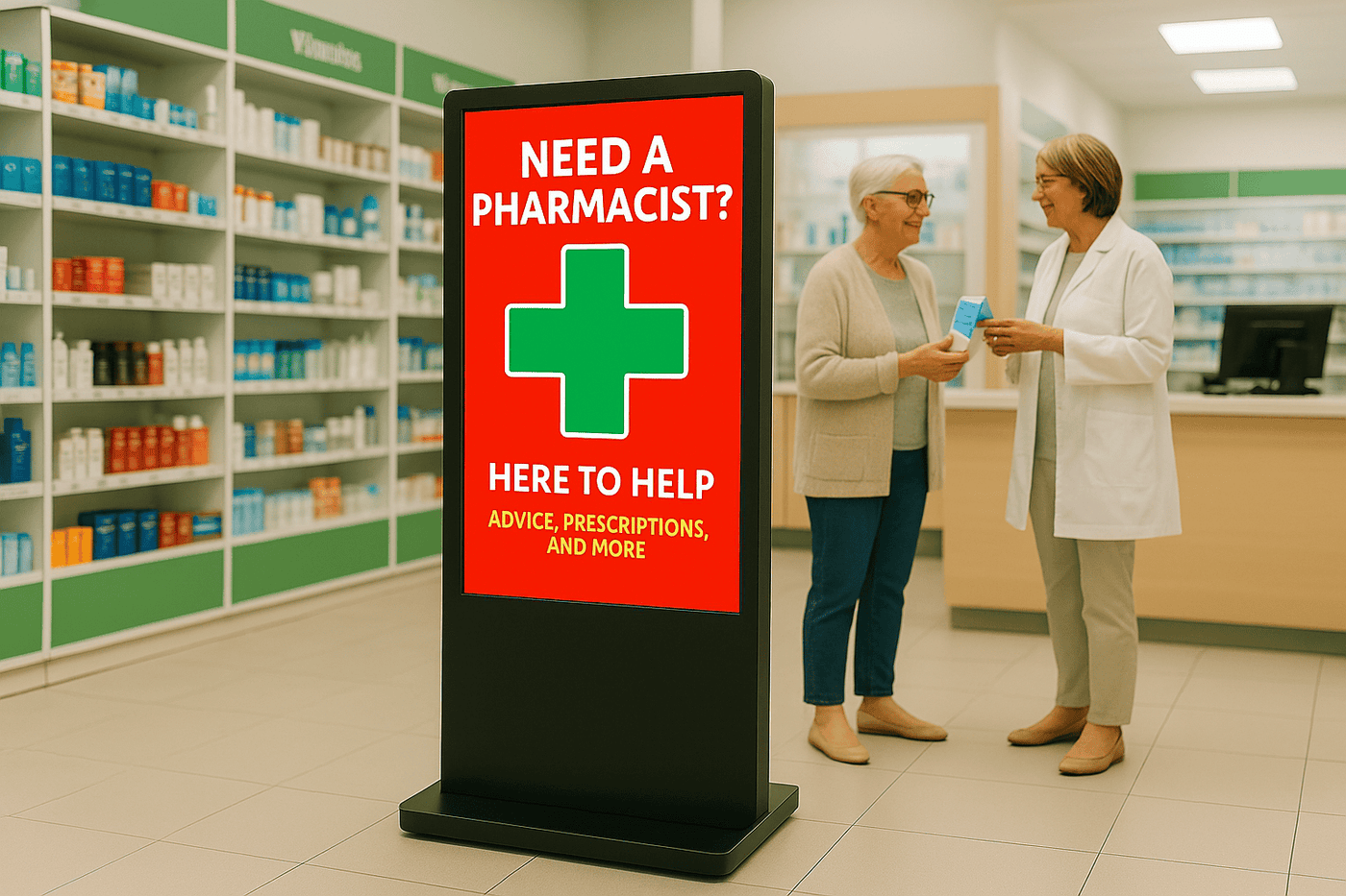 Multilingual messages, large clear fonts, captioned video content — Khazina signage helps pharmacies, beauty shops, and opticians serve every guest with care and excellence.
