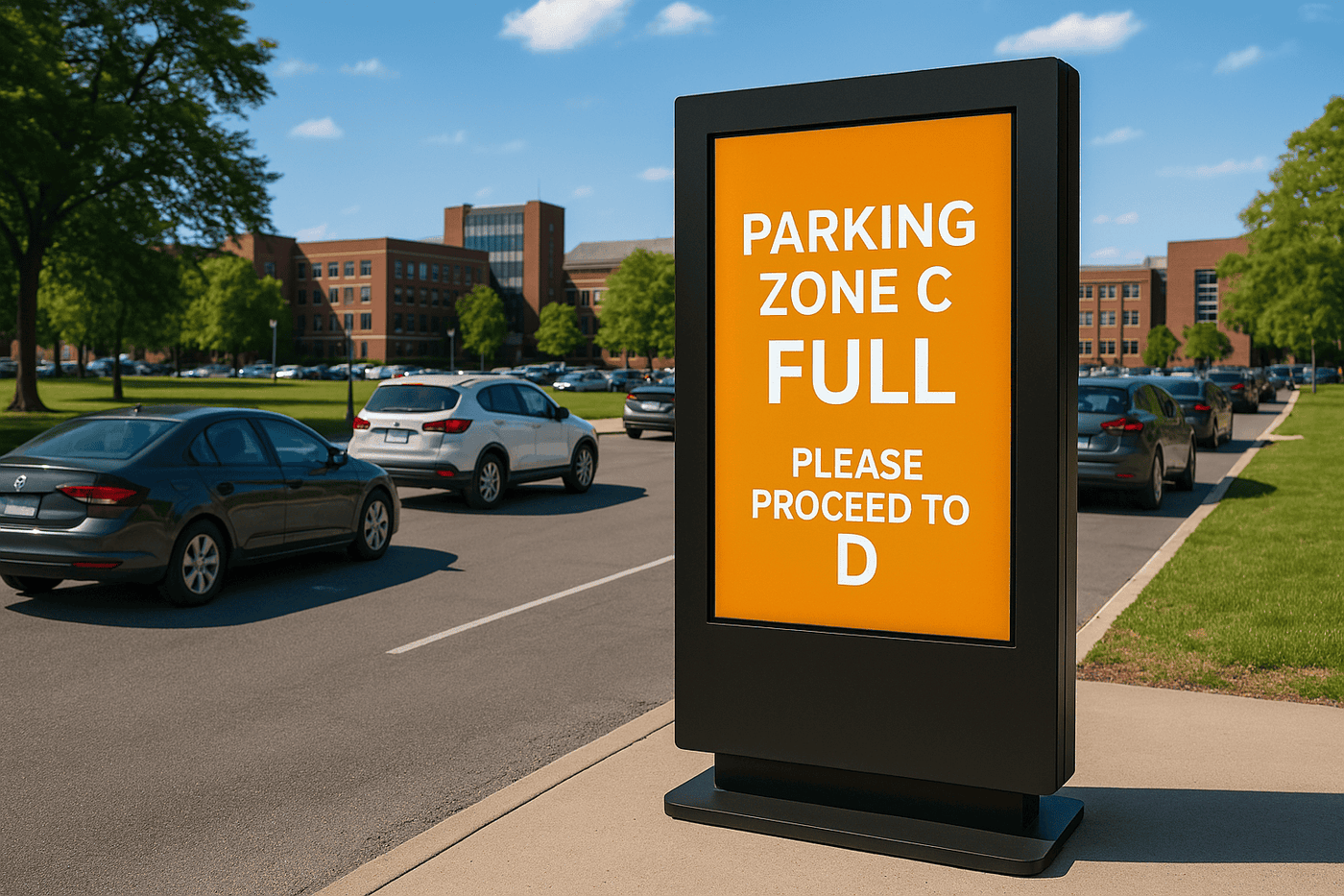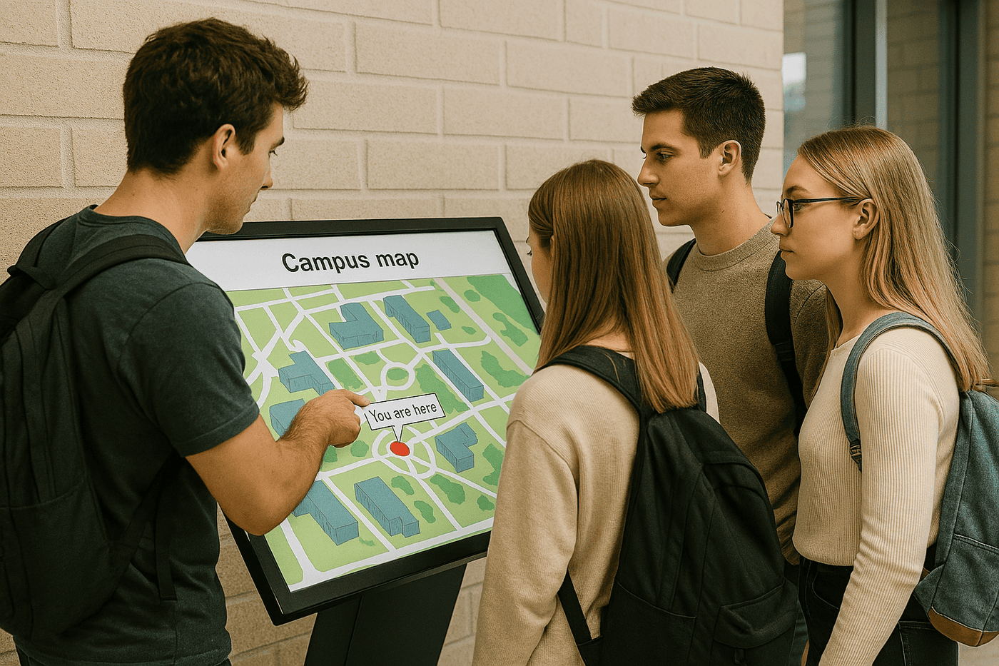 Dynamic wayfinding signage guides new students, visitors, and guests effortlessly to:- Departments